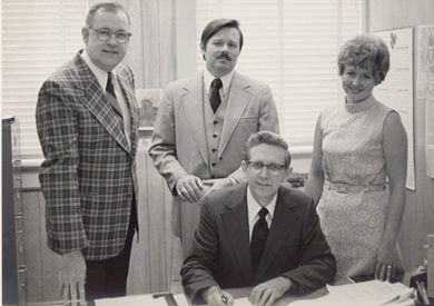 Pictured, left to right, are: A. F. Weaver, President of the Mineral Wells Heritage Association; L. Gordon Nelson, Vice President; Mrs. Gordon Nelson, Chairperson for the Restoration Committee. Seated is Bill Hall, Superintendent of Mineral Wells Schools